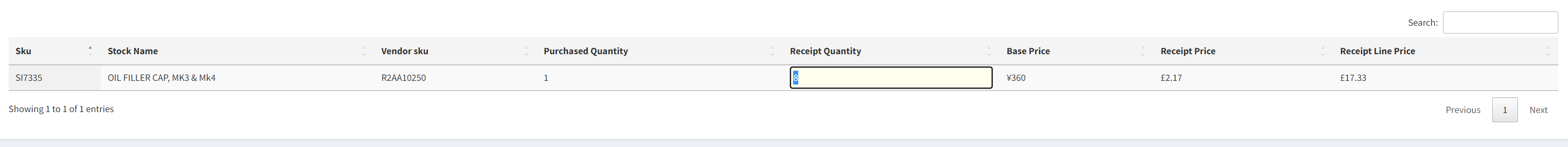 - Grid Edits – When there are Products in the grid and you want to confirm you are in receipt of them. You can simply click into the highlighted column named “Receipt Qty”, and per row you are able type in whatever value that was received. Pressing TAB will save the value and take you to the row below it