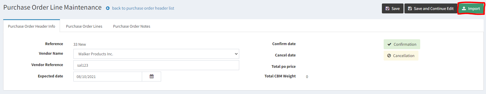 Once you have a Purchase Order you will notice at the top right corner of the screen there is a button called “Import” (Note: The button will not appear if the PO is Closed). Please press this and you will be redirected to the Import screen.